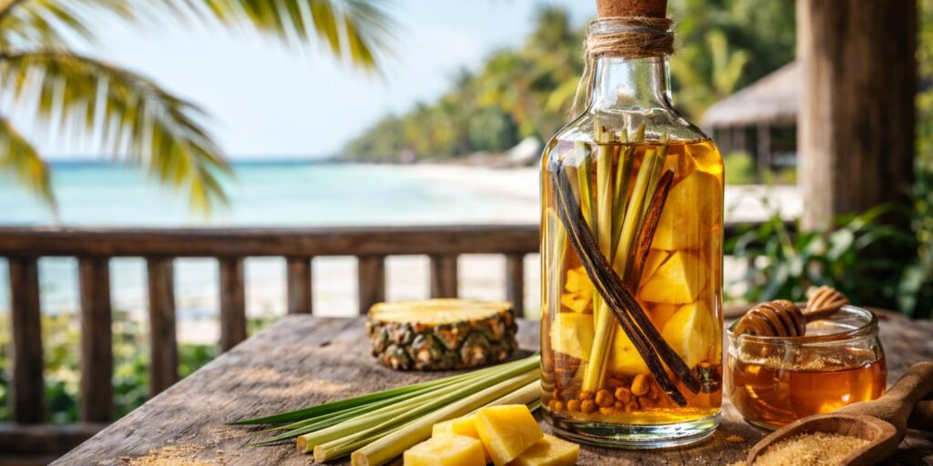 Cette recette-là, c’est celle que je sors quand j’ai envie d’un rhum arrangé plus doux, plus enveloppant, presque réconfortant. La citronnelle garde le mélange bien droit, sans le laisser devenir trop lourd, pendant que la vanille apporte de la rondeur et que le miel adoucit le tout avec beaucoup de gourmandise.