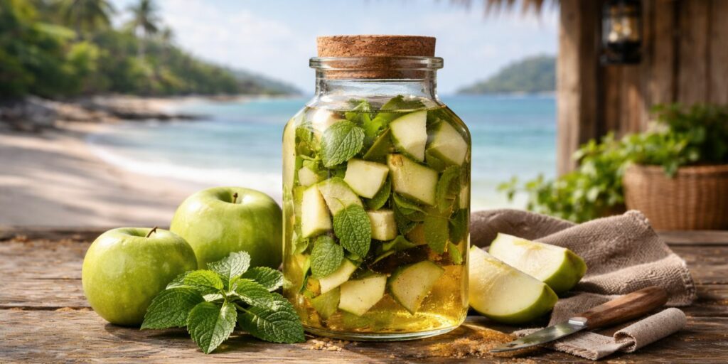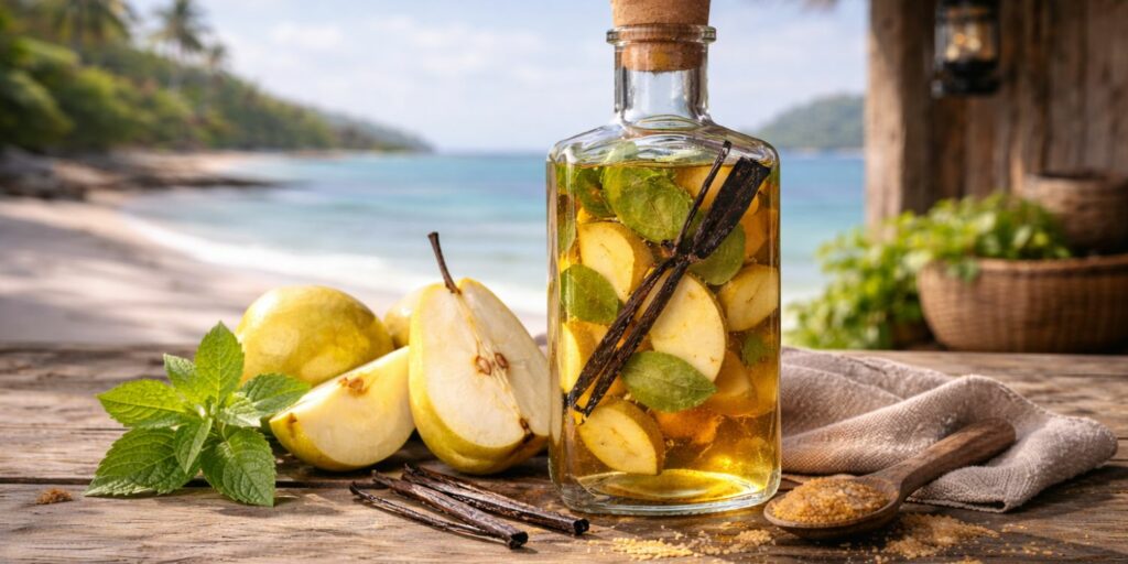J’aime bien cette recette quand je veux proposer un rhum arrangé un peu différent, mais sans partir dans des associations trop exotiques. La pomme verte, ça rassure tout le monde, et avec la mélisse ça marche vraiment bien. Petit conseil perso : ne surchargez pas en sucre, sinon vous perdez la fraîcheur qui fait tout l’intérêt de la recette.