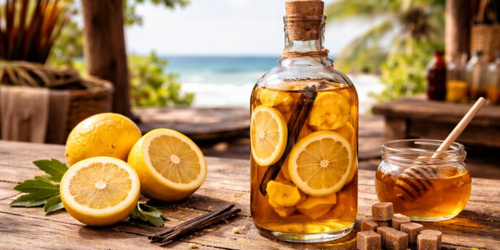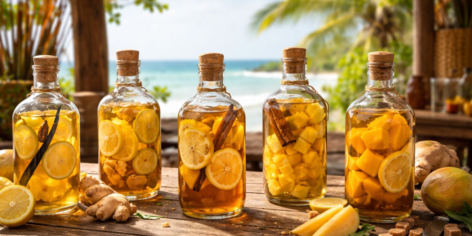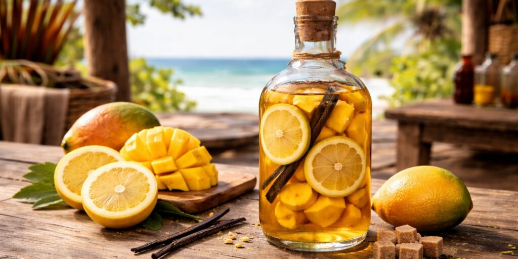 La mangue apporte tout de suite un côté plus velouté, plus généreux et très gourmand. Avec le yuzu, ça fonctionne étonnamment bien, parce que l’agrume vient casser le côté parfois un peu lourd de la mangue. Du coup, on garde un rhum arrangé fruité, mais avec de la fraîcheur et une vraie personnalité. C’est une recette que j’aime recommander à ceux qui veulent une bouteille conviviale, facile à partager, avec un parfum original mais pas compliqué. Et là encore, pas besoin de chercher des produits rares : une belle mangue mûre du commerce fera très bien le travail.